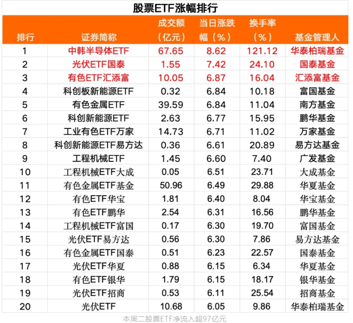 从市场表现来看,新能源、有色板块领涨。当日涨幅前十大股票ETF中,新能源板块占据4席,有色、工程机械分别占据3席和2席。