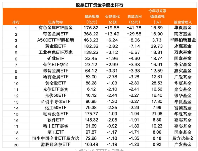 此外,股票ETF中,当日26只股票ETF净流出超过1亿元,有色金属、光伏等行业主题ETF是资金净流出较多的品种。