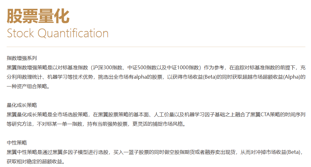 上海黑翼资产管理有限公司(简称 “黑翼资产”)黑翼资产成立于2014年,是国内首批成立的量化投资机构之一,资产管理规模超过200亿元,连续6年蝉联中国私募金牛奖。两位创始人陈泽浩和邹倚天均为国内第一批华尔街归国量化投资经理,均拥有18年海内外量化投资实战经验。目前,黑翼资产已实现全流程AI量化投资,并构建了多元化的策略矩阵,覆盖量化选股、指数增强、市场中性、多策略、量化CTA等产品线。