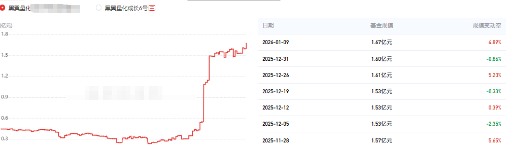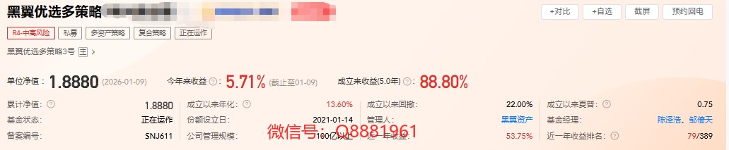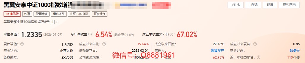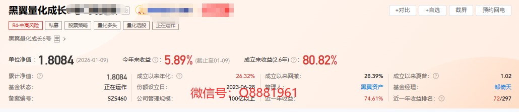 该只私募基金产品为股票策略,今年以来的收益为5.89%,成立2.6年以来的收益为80.82,其中我们来看一下具体数据,成立以来的夏普比为1.02,成立以来的回撤为28.39%,单位净值为1.8084,通过图片,可以观察到这支基金产品的基金规模,截止到2026/1/9的基金规模为1.67亿元。想追踪最新的基金信息,微信扫描文章下方二维码了解更多信息,加我微信不迷路。