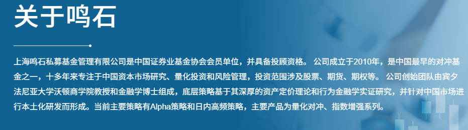 上海鸣石私募基金管理有限公司成立于2010年,业内率先采用“五环多核”的量化流水线式多核心投研模式,打造了因子、人工智能、优化、交易、风控等五个核心投研环节,拥有十三个核心投研团队,多个投研核心可以保证策略研发的持续性和稳定性。鸣石基金是一家致力于为客户提供资产管理服务的专业量化投资机构,其资产管理服务范围包括股票、债券、期货以及其他金融衍生品等。公司在中国证券投资基金业协会登记为私募投资基金管理人(登记编号:P1005659)。公司投研团队实力雄厚,汇聚了一批来自美国宾夕法尼亚大学沃顿商学院等名校,具有资深金融学术背景、掌握前沿金融理论的投研人员,并吸引了AI、计算机、数据等领域的顶级人才,致力于以适合中国市场的量化投资方法为国内投资者寻求稳健的投资收益。
