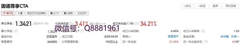 该只私募基金产品为R5高风险,今年以来的收益为3.41%,成立1.7年以来的收益为34.21%,其中我们来看一下具体数据,成立以来的夏普比为1.53,成立以来的回撤为6.45%,单位净值为1.3421,通过图片,可以观察到这支基金产品的基金规模,截止到2026/1/16的累计净值为1.3421。想追踪最新的基金信息,微信扫描文章下方二维码了解更多信息,加我微信不迷路。