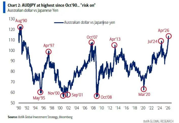 与此形成对比的是,XLF跌破200日均线,金融板块的疲软暗示此轮上涨缺乏足够市场广度。澳元兑日元同期升至1990年10月以来最高水平,Hartnett将其视为风险偏好极度高涨的缩影,同时也将这一"周期性货币对避险货币"的极端强势列为市场过热的参考指标之一。头部私募基金长期跟踪,帮你分析市场、根据行情配置产品,欢迎添加微信:Q8881961。