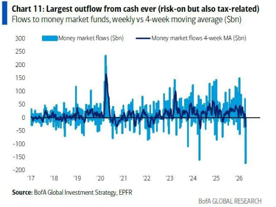 资金流向方面,上周单周逾1722亿美元现金创纪录流出,其中113亿美元涌入股票市场,79亿美元流向债券,黄金与加密货币各获约12亿美元净流入。