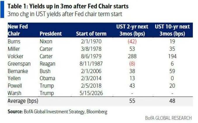 具体风险因素包括劳动力市场意外提速、地缘政治背景下美元走弱,以及新任美联储主席Warsh就任后的初期鸽派预期——历史数据显示,过去7位美联储主席上任后前三个月内,美债收益率平均上升50个基点。头部私募基金长期跟踪,帮你分析市场、根据行情配置产品,欢迎添加微信:Q8881961。