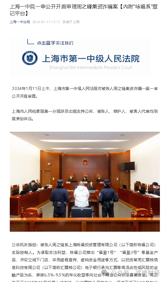 2024年1月11日上午,上海市第一中级人民法院对被告人周之锋集资诈骗一案一审公开开庭审理。
