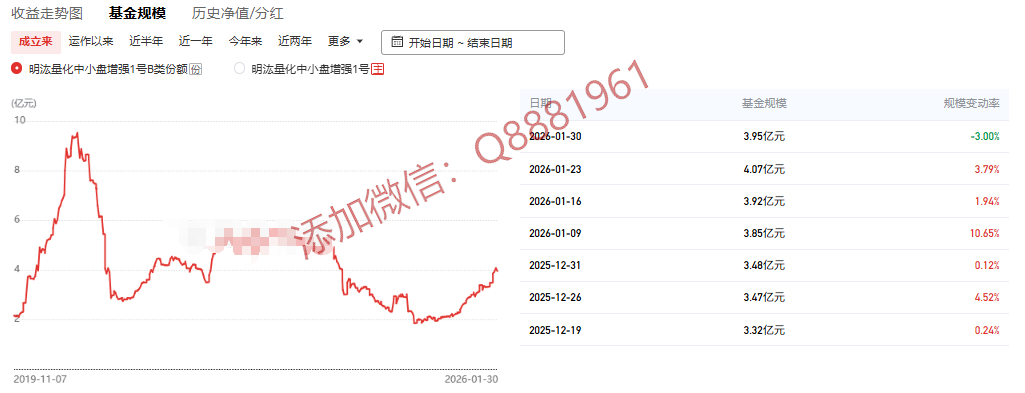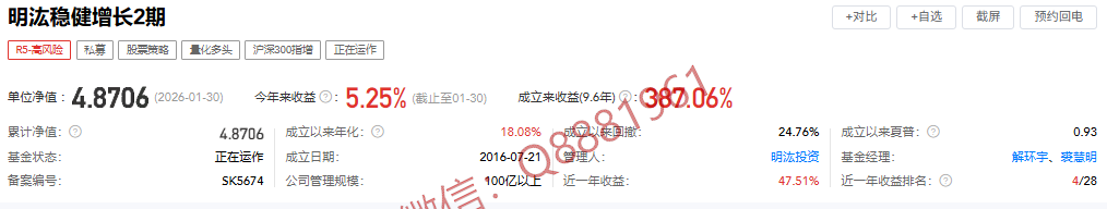 该只私募基金产品为R5高风险,今年以来的收益为5.25%,成立9.6年以来的收益为387.06%,其中我们来看一下具体数据,成立以来的夏普比为0.93,成立以来的回撤为24.76%,单位净值为4.8706,通过图片,可以观察到这支基金产品的基金规模,截止到2026/1/30的累计净值为4.8706。想追踪最新的基金信息,微信扫描文章下方二维码了解更多信息,加我微信不迷路。