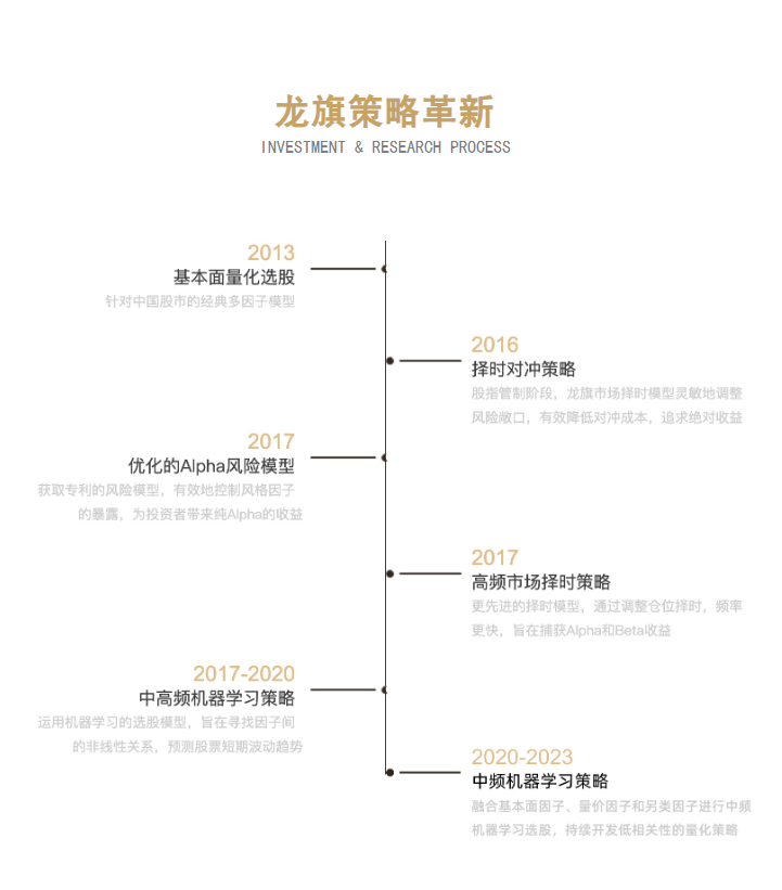 需要强调的是,龙旗所有策略都是程序化交易,基于获得专利的自主研发的智能化的投资组合管理系统、交易系统。从2017年后,风险控制模型不断优化,自主研发的风控系统也已获得专利。目前龙旗的投资子策略丰富且策略容量较为充裕。龙旗科技以研究为基石,强调持续创新和严格的风控。在量化领域不断探索精进,从早年关注alpha到灵活捕捉beta机会再到严格控制sigma策略风险。龙旗追求的是在不同的市场环境下,都能迭代开发出适合当下市场的稀缺策略,成为量化领域的长跑者。