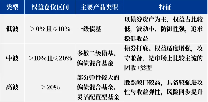 核心特点:①攻守兼备:债券提供“安全垫”,权益资产博取弹性收益;②根据权益仓位占比,可分为低波(≤10%)、中波(10%-20%)、高波(>20%)。