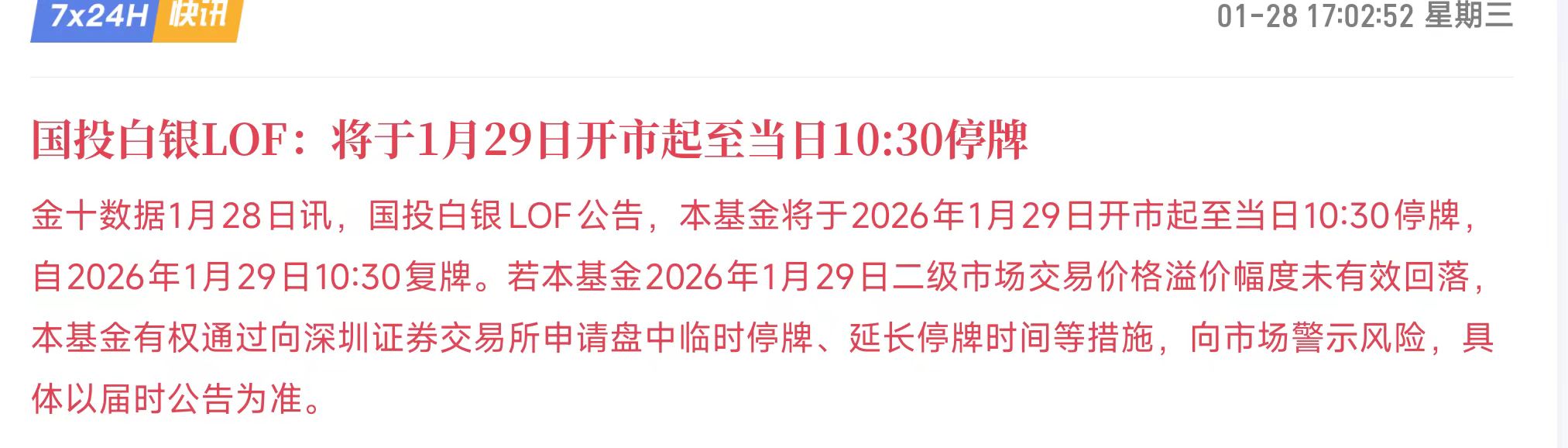 这则快讯说明,国投白银 LOF 基金出于风险警示目的,将在 1 月 29 日进行临时停牌,具体细节如下: