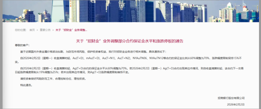 招商银行公告表示,鉴于近期国内外贵金属价格波动加剧,为防范市场风险、保护投资者权益,该行对“招财金”业务进行相关调整。