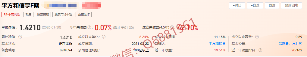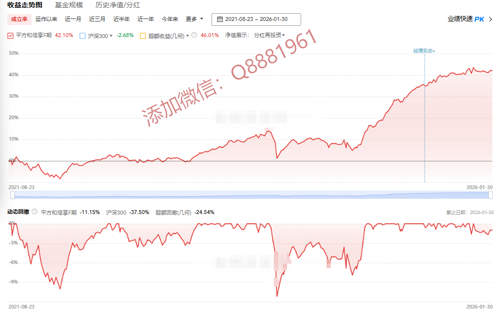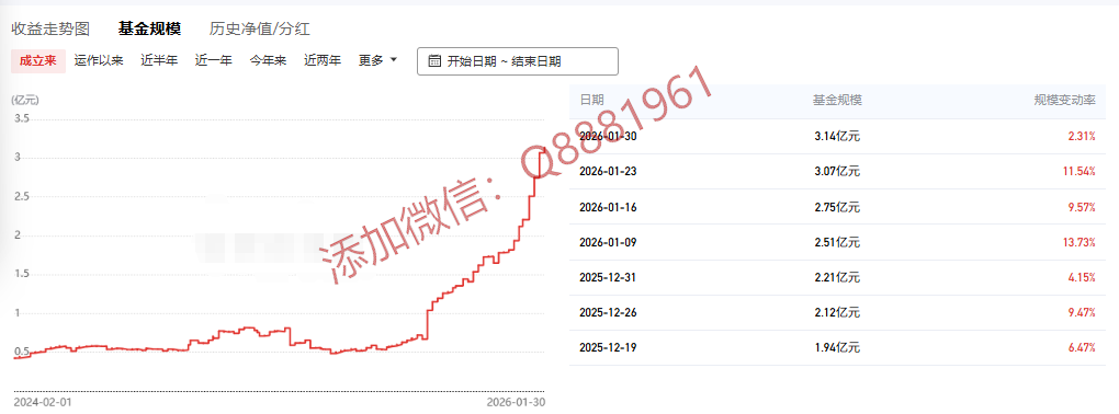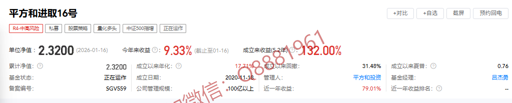 该只私募基金产品为R4中高风险,今年以来的收益为9.33%,成立5.2年以来的收益为132%,其中我们来看一下具体数据,成立以来的夏普比为0.76,成立以来的回撤为31.48%,单位净值为2.3200,通过图片,可以观察到这支基金产品的基金规模,截止到2026/1/16的累计净值为2.3200。想追踪最新的基金信息,微信扫描文章下方二维码了解更多信息,加我微信不迷路。