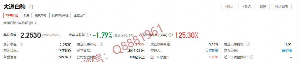 该只私募基金产品为R5高风险,今年以来的收益为-1.79%,成立8.6年以来的收益为125.30%,其中我们来看一下具体数据,成立以来的夏普比为1.51,成立以来的回撤为5.16%,单位净值为2.2530,通过图片,可以观察到这支基金产品的基金规模,截止到2026/8/27的累计净值为2.2530。免费帮助投资人进行私募产品分析,100万起投优质产品推荐,欢迎添加微信Q8881961