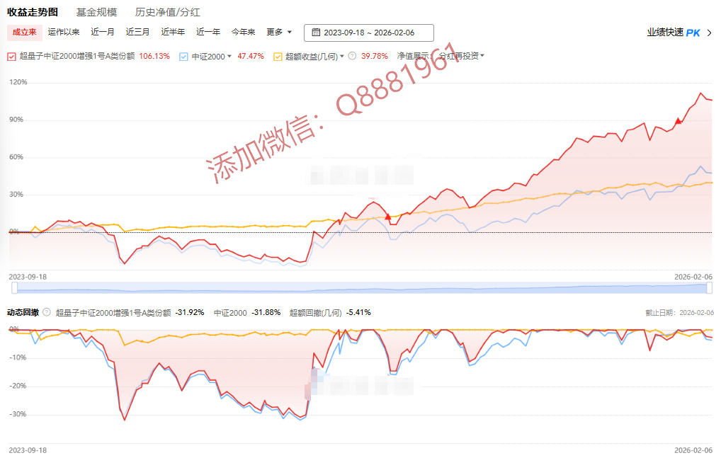 该只私募基金产品为R5高风险,今年以来的收益为7.36%,成立3.1年以来的收益为84.50%,其中我们来看一下具体数据,成立以来的夏普比为0.85,成立以来的回撤为23.63%,单位净值为1.0642,通过图片,可以观察到这支基金产品的基金规模,截止到2026/2/6的累计净值为1.7979。想追踪最新的基金信息,微信扫描文章下方二维码了解更多信息,加我微信不迷路。