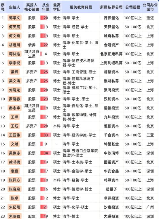 根据私募网站不完全统计,头部私募实控人出自清华大学(本硕博皆可)的有23位,占比约9.5%。其中百亿私募实控人占13位、准百亿(50-100亿,下同)占10位,包括诚奇私募何文奇、中欧瑞博吴伟志、华安合鑫袁巍等。