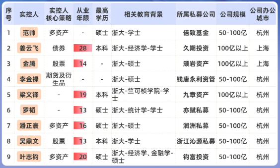 根据私募网站不完全统计,头部私募实控人出自浙江大学(本硕博皆可)的有9位,占比约3.7%。其中6位为准百亿私募实控人,百亿私募实控人则占3位,包括倍致基金范帅、钧富投资叶志钧等。
