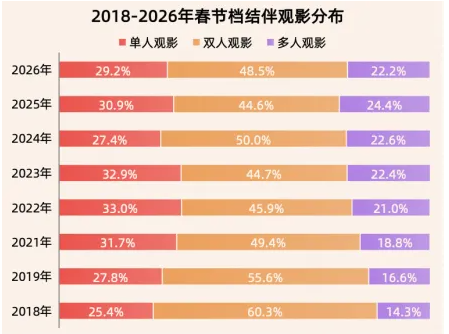 《报告》显示,春节档期间,双人观影占比48.5%、多人观影占比22.2%,双人和多人观影合计占比再破70%,社交需求仍是春节档观影的稳定基石。