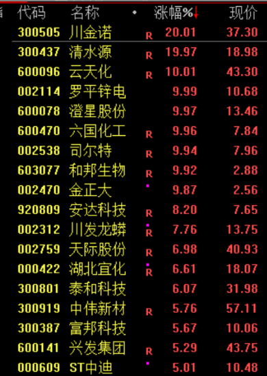 磷化工板块再度大涨,川金诺、清水源等多股涨停。