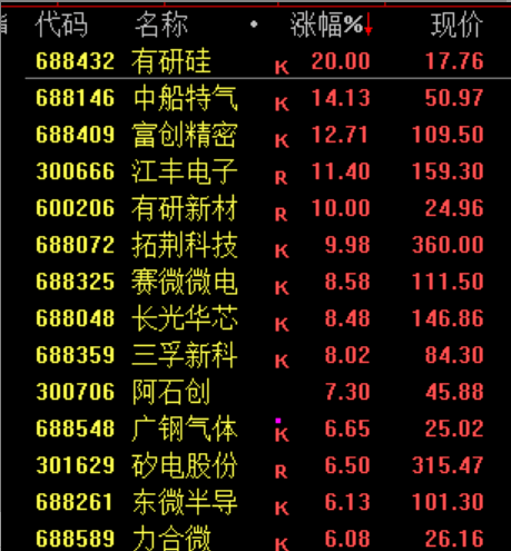 半导体产业链午后走强,有研硅20cm涨停。