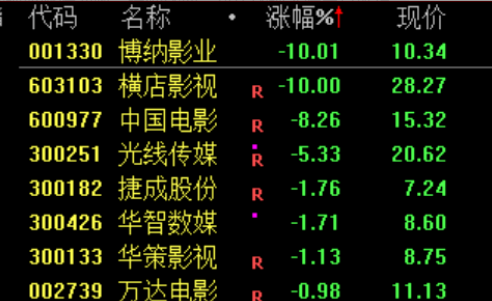 下跌方面,影视股继续调整,博纳影业、横店影视连续两日跌停。
