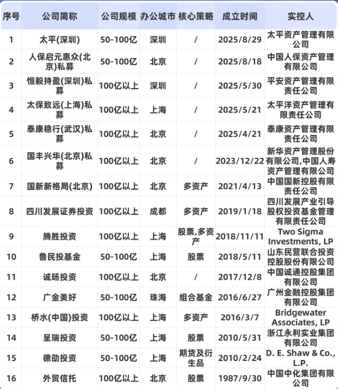 除了实控人为自然人的头部私募,还有16家私募实控人为机构,这些机构背景包括了国企、外资。在这些机构私募中,险资私募占多数,包括太平(深圳)、人保启元惠众(北京)私募、恒毅持盈(深圳)私募、太保致远(上海)私募、泰康稳行(武汉)私募等。在政策持续鼓励长钱长投的背景下,险资正加速通过布局私募基金等方式积极参与市场。
