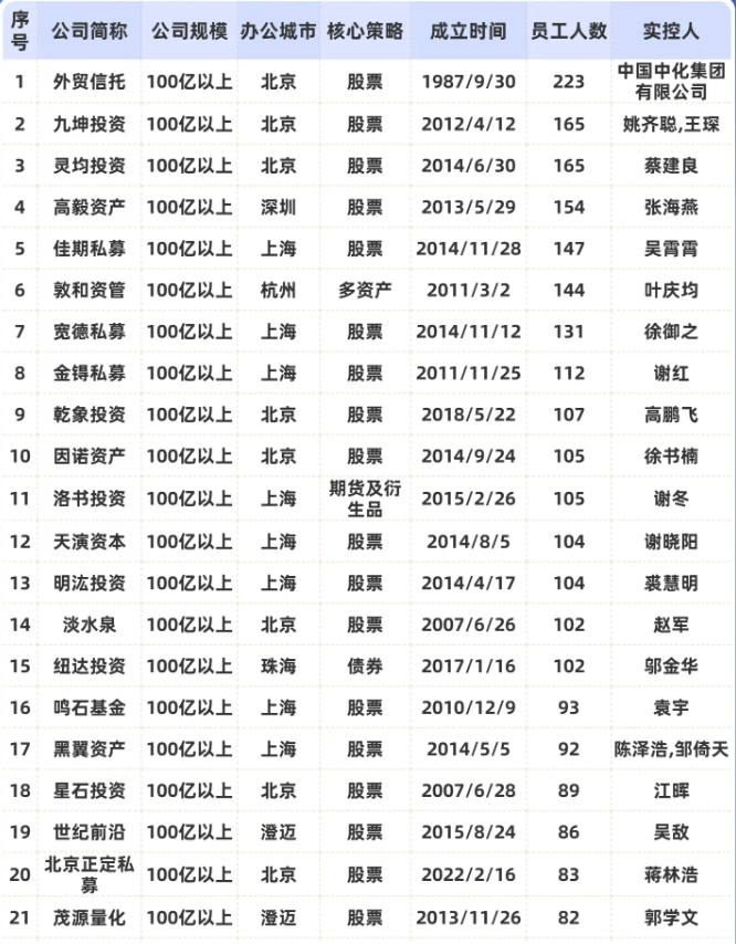 九坤、高毅、敦和等15家头部私募员工人数过百!
