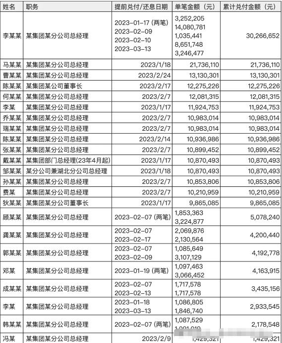 2023年1月至3月期间,某集团旗下多家分公司高管密集发生大额提前兑付操作,涉及人员众多、金额巨大,具体明细整理如下: