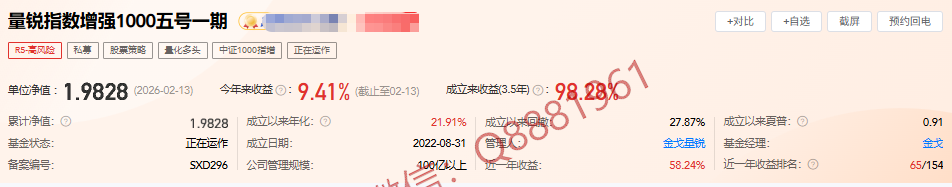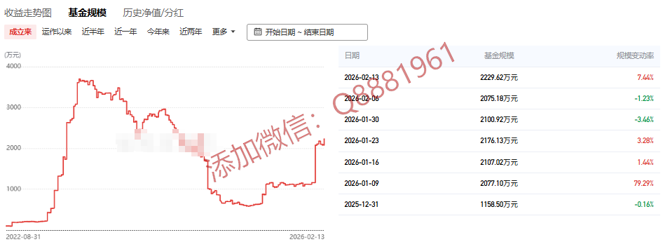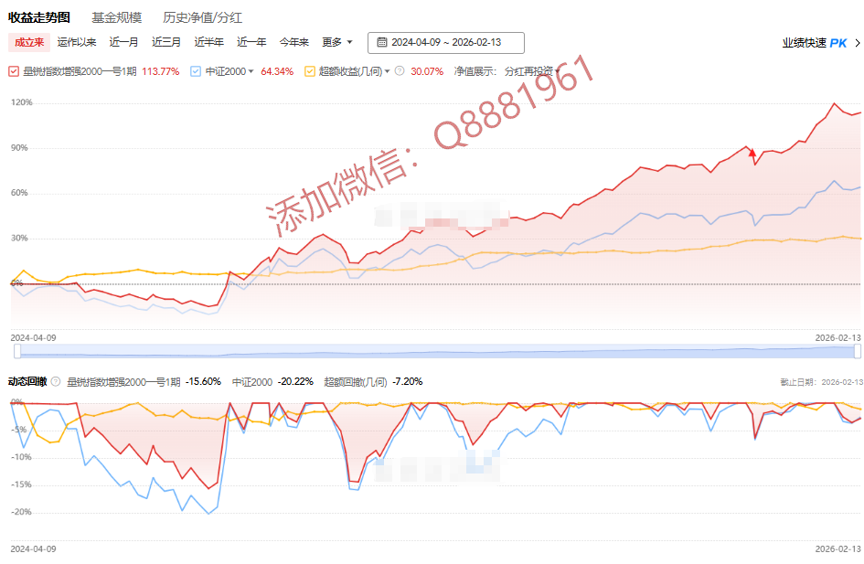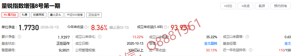 该只私募基金产品为R5高风险,今年以来的收益为8.36%,成立5.4年以来的收益为93.95%,其中我们来看一下具体数据,成立以来的夏普比为0.63,成立以来的回撤为35.22%,单位净值为1.7730,通过图片,可以观察到这支基金产品的基金规模,截止到2026/2/13的累计净值为1.7730。诚邀进百人私募投资群,深度解析私募策略与收益,百万起投可加微信Q8881961详聊。