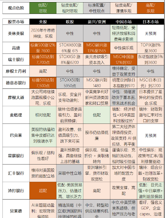 各个投行的资产建议表达方式差异较大,预测的资产也不一致,有些给了明确的指数点位,有些只能通过字里行间体会其观点,对资产预测表述也比去年更模糊,出现较多被归入轻度乐观/悲观的区间。