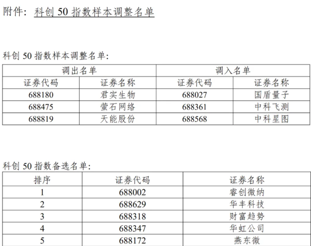 其中,科创50指数更换3只样本。国盾量子、中科飞测、中科星图将被调入科创50指数。此外,热景生物、斯瑞新材、君实生物等10只证券将被调入科创100指数。