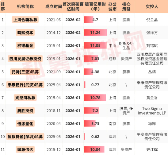 接下来,笔者将为大家盘点私募破百亿用时的全名单、2026年破百亿的私募名单以及破百亿用时不足1年的私募名单。