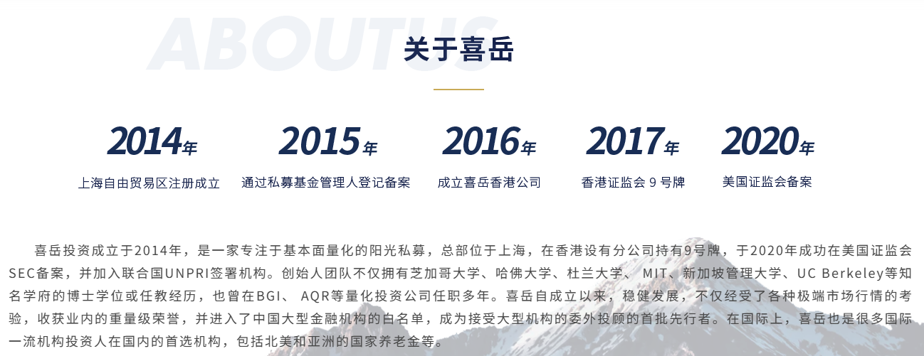 喜岳投资成立于2014年,是一家专注于基本面量化的私募基金,总部位于上海,2015年登记成为基金业协会私募基金管理人并注册成为协会观察会员,公司具备基金业协会对投资顾问“3+3”的资格要求。2017年于香港设有分公司并持有香港证监会SFC牌照,2020年获批准在美国证监会备案。创始合伙人均为美国名校博士学位,并具备世界著名高校任教或全球大型资产管理公司(贝莱德和 AQR)任职等背景。团队学术背景深厚,专业上紧密合作数十年,研究领域相辅相成,投资经验丰富,覆盖了股票、股指、债券、衍生品、货币、商品等大类资产类别。