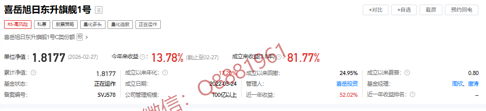 该只私募基金产品为R5高风险,今年以来的收益为13.78%,成立3.8年以来的收益为81.77%,其中我们来看一下具体数据,成立以来的夏普比为0.8,成立以来的回撤为24.95%,单位净值为1.8177,通过图片,可以观察到这支基金产品的基金规模,截止到2026/2/27的累计净值为1.8177。诚邀进百人私募投资群,深度解析私募策略与收益,百万起投可加微信Q8881961详聊。