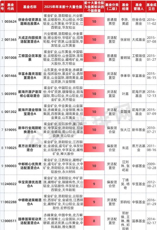 基于公募基金2025年末前十大重仓股的数据,笔者在主动权益基金中筛选出重仓有色金属(持股>5只)的基金共36只,其中9只基金更是全仓布局有色金属板块。从管理人角度看,中邮、前海开源、工银瑞信、国投瑞银等机构均有2只以上产品在列,从持仓集中度来看,紫金矿业、洛阳钼业、华友钴业均获10只以上基金共同重仓。