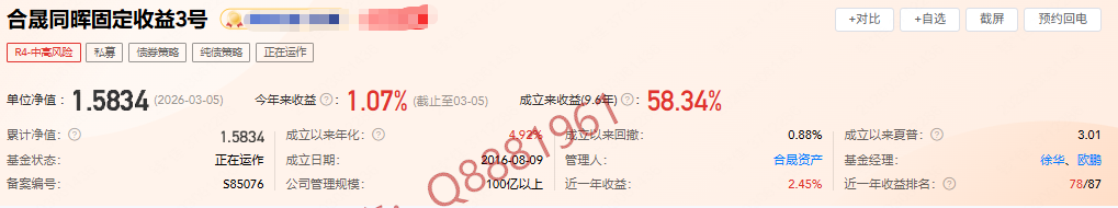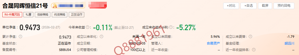 该只私募基金产品为R4中高风险,今年以来的收益为-0.11%,成立0.6年以来的收益为-5.27%,其中我们来看一下具体数据,成立以来的夏普比为-1.79,成立以来的回撤为5.96%,单位净值为0.9473,通过图片,可以观察到这支基金产品的基金规模,截止到2026/2/27的累计净值为0.9473。诚邀进百人私募投资群,深度解析私募策略与收益,百万起投可加微信Q8881961详聊。