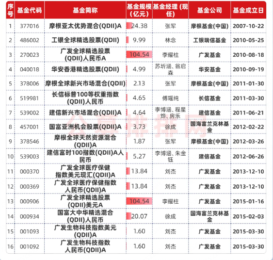 据公募排排网数据,在上个月(2026年2月),基金净值曾创下历史新高且成立满10年的“QDII权益类基金”共有16只。其中,广发基金有6只产品在列,摩根基金(中国)有3只产品在列,国海富兰克林基金、建信基金各有2只产品在列。
