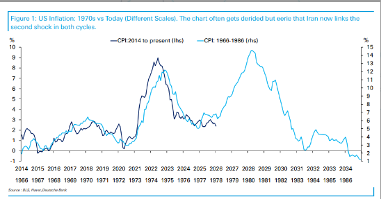 德银警告,油价走势与1970年代石油危机存在“惊人相似”:两轮风暴均发生在通胀大爆发后的4-5年,且震中均指向伊朗。不过,德银指出当前通胀预期稳固、经济抗压性更强,不会轻易陷入70年代那种“工资-价格螺旋”导致的滞胀噩梦。