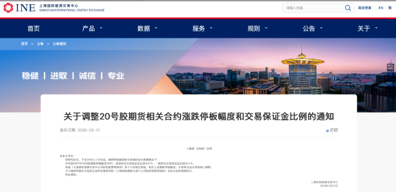相关合约涨跌停板幅度和交易保证金比例 3月12日,上期能源发布通知,下述合约自上市时起,涨跌停板幅度和交易保证金比例调整如下: 20号胶NR2703合约的涨跌停板幅度为9%,套保持仓交易保证金比例为10%,一般持仓交易保证金比例为11%。