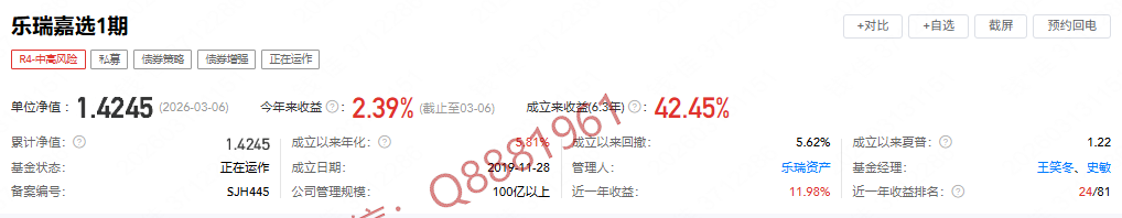 该只私募基金为债券策略、债券增强,成立6.3年以来收益为42.45%,今年以来收益为2.39%,单位净值为1.4245,成立以来最大回撤为5.62%,关于单位净值的变化,大家可以参考图片中的净值情况。想买私募产品,想投资,买哪种,如何买?如果您有这样的疑问,请加我微信Q8881961详细咨询关于私募基金产品的情况,我将根据您的风险偏好等综合情况评估,给您推荐最合适的私募产品,投资找我不迷路。