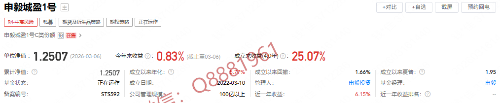 该只私募基金产品为R4中高风险,今年以来的收益为0.83%,成立4年以来的收益为25.07%,其中我们来看一下具体数据,成立以来的夏普比为1.95,成立以来的回撤为1.66%,单位净值为1.2507,通过图片,可以观察到这支基金产品的基金规模,截止到2026/3/6的累计净值为1.2507。诚邀进百人私募投资群,深度解析私募策略与收益,百万起投可加微信Q8881961详聊。