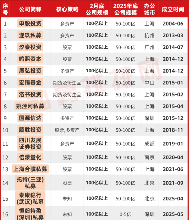 在2026年1-2月份,公司管理规模跃升为100亿元以上的私募共有16家,百亿私募因此扩容至126家,数量再创历史新高。(参考:百亿私募达126家,再创历史新高!3家新晋,1家重回!)