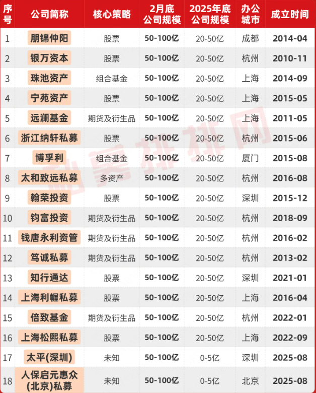 今年1-2月规模跃升至50-100亿元的私募