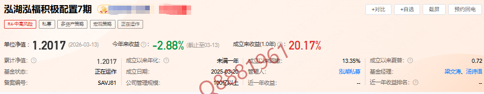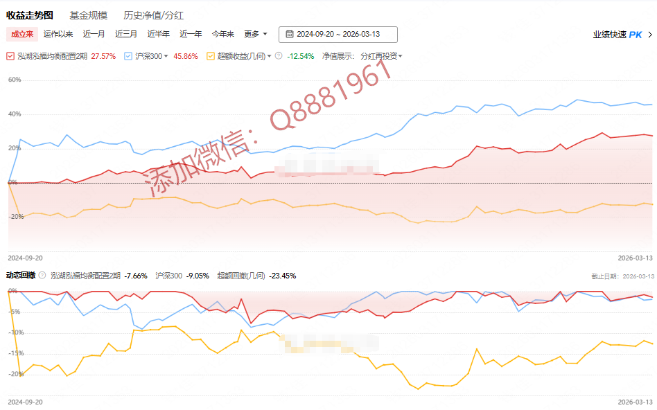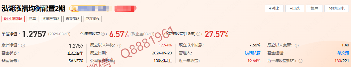 该只私募基金产品为R5高风险,今年以来的收益为-3.29%,成立3.2年以来的收益为149.02%,其中我们来看一下具体数据,成立以来的夏普比为1.14,成立以来的回撤为22.07%,单位净值为2.4902,通过图片,可以观察到这支基金产品的基金规模,截止到2026/3/13的累计净值为2.4902。诚邀进百人私募投资群,深度解析私募策略与收益,百万起投可加微信Q8881961详聊。