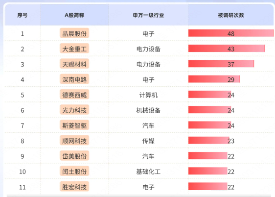 此外,电子行业个股深南电路和胜宏科技以及计算机行业个股德赛西威等AI概念股均位列前十,依次被调研29次、22次和24次。调研深南电路主要了解公司受益于AI算力基础设施硬件相关产品需求增长的PCB业务情况;调研胜宏科技主要围绕公司在PCB领域的竞争优势等展开;调研德赛西威主要围绕公司新业务机器人智能基座AICube展开。
