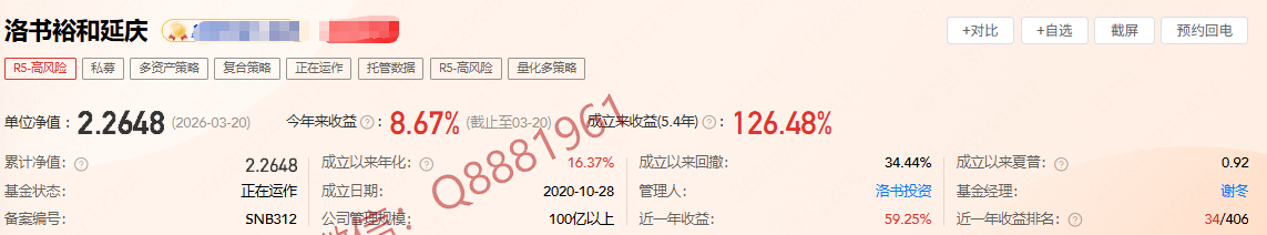 该只私募基金为多资产策略、复合策略,成立5.4年以来收益为126.48%,今年以来收益为8.67%,单位净值为2.2648,成立以来最大回撤为34.44%,关于单位净值的变化,大家可以参考图片中的净值情况。想买私募产品,想投资,买哪种,如何买?如果您有这样的疑问,请加我微信Q8881961详细咨询关于私募基金产品的情况,我将根据您的风险偏好等综合情况评估,给您推荐最合适的私募产品,投资找我不迷路。