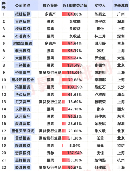 截至2026年2月末,5-10亿规模组中,在私募排排网上至少有3只产品有近5年业绩展示的老牌私募共有22家,近5年收益均值为152.42%。