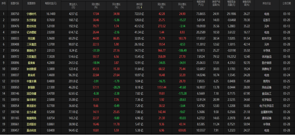 1.龙头效应显著:宁德时代在营收、净利润规模上遥遥领先,是创业板绝对的盈利核心;东方财富作为金融科技龙头,盈利体量也远超多数制造业公司。