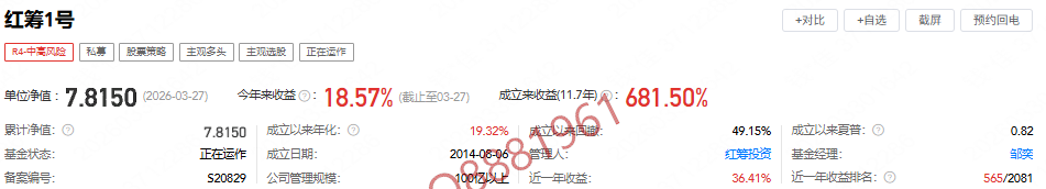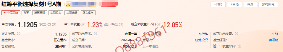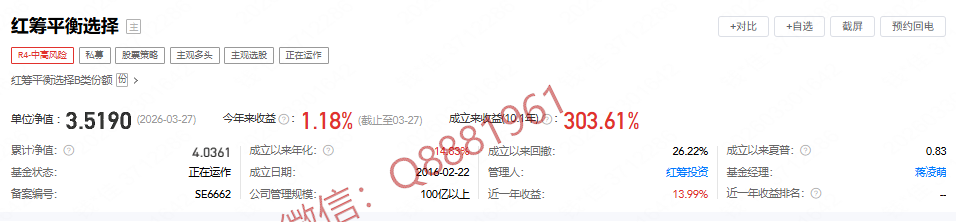 该只私募基金产品为R4中高风险,今年以来的收益为1.18%,成立10.1年以来的收益为303.61%,其中我们来看一下具体数据,成立以来的夏普比为0.83,成立以来的回撤为26.22%,单位净值为3.5190,通过图片,可以观察到这支基金产品的基金规模,截止到2026/3/27的累计净值为3.5190。诚邀进百人私募投资群,深度解析私募策略与收益,百万起投可加微信Q8881961详聊。