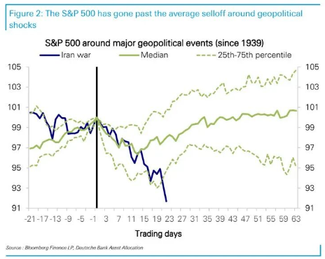 自2月27日收盘至今,标普500指数累计下跌7.4%,这一跌幅已超过德意志银行统计的历史地缘冲突事件中6.1%的中位最大回撤。