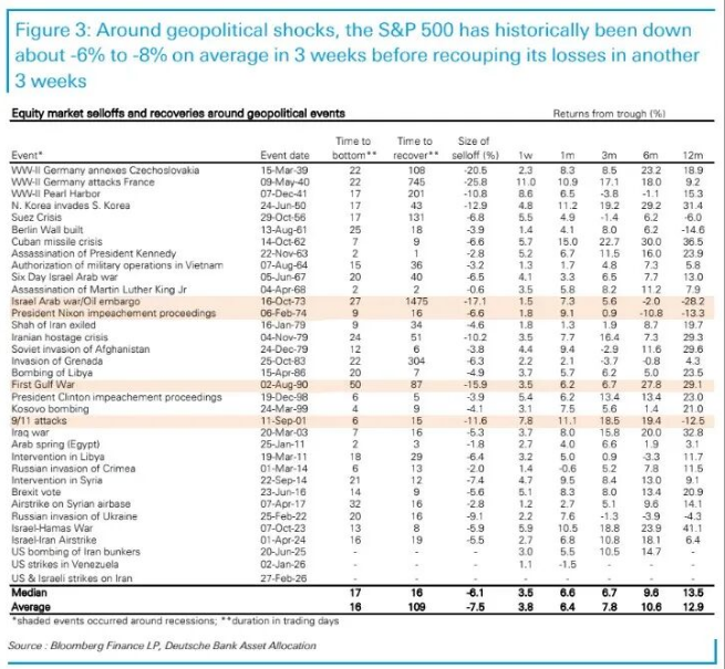 德意志银行策略师团队此前整理的一张数据表,一度成为市场的"操作手册"。该表显示,历史上标普500指数在地缘冲击后平均16个交易日触底,平均修复周期为109天——不过这一数字受1973年阿拉伯石油禁运事件严重拉高,彼时标普500耗费逾五年半才收复失地。